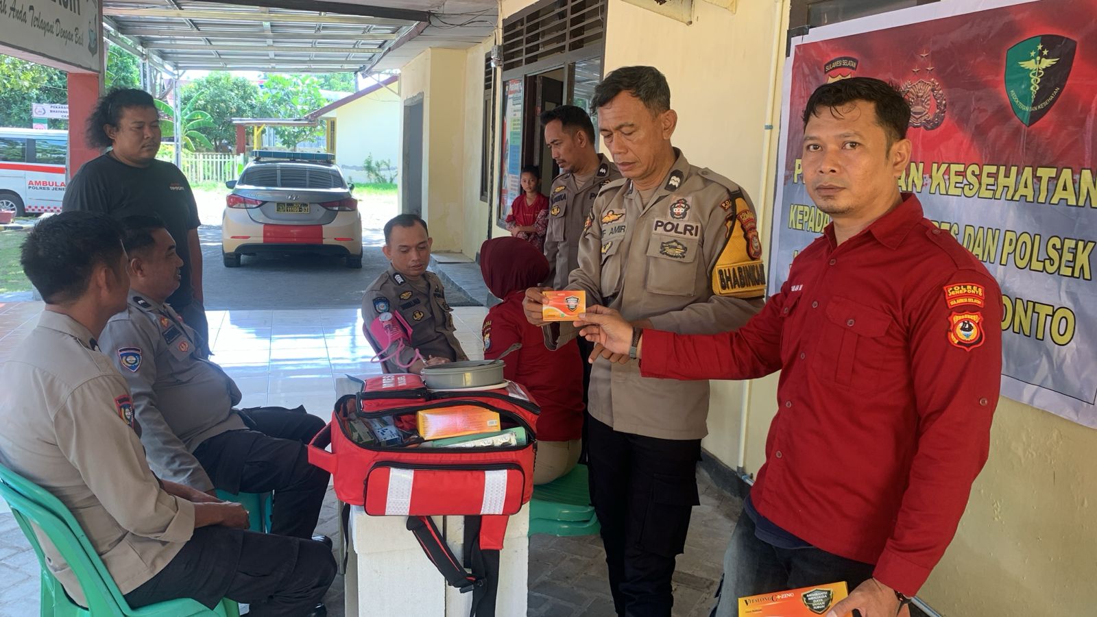 Pelayanan kesehatan ini meliputi pemeriksaan tanda-tanda vital (TTV), pemeriksaan gula darah sewaktu (GDS), serta pemberian obat dan multivitamin. Program ini bertujuan untuk memasti kan kesehatan para personel tetap terpantau dan dalam kondisi prima, terutama pasca pelaksanaan tugas pengamanan Pemungutan Suara.
