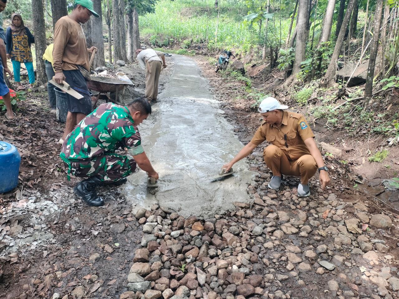 Dalam kegiatan gotong royong tersebut terlihat Babinsa juga lihai membantu warga binaannya yang sedang melakukan pengecoran untuk memperkeras jalan desa di wilayah binaan,