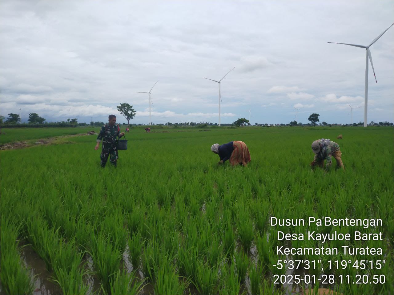 Pada kesempatan kali ini, Babinsa Serda Munawir melaksanakan pemupukan di area sawah milik Saharuddin Beta dengan Luas Lahan 1 Ha warga Desa Kayuloe Barat Dusun Pa’Bentengan Desa Kayuloe Barat Kecamatan Turatea Kabupaten Jeneponto Selasa 28/01/2025.