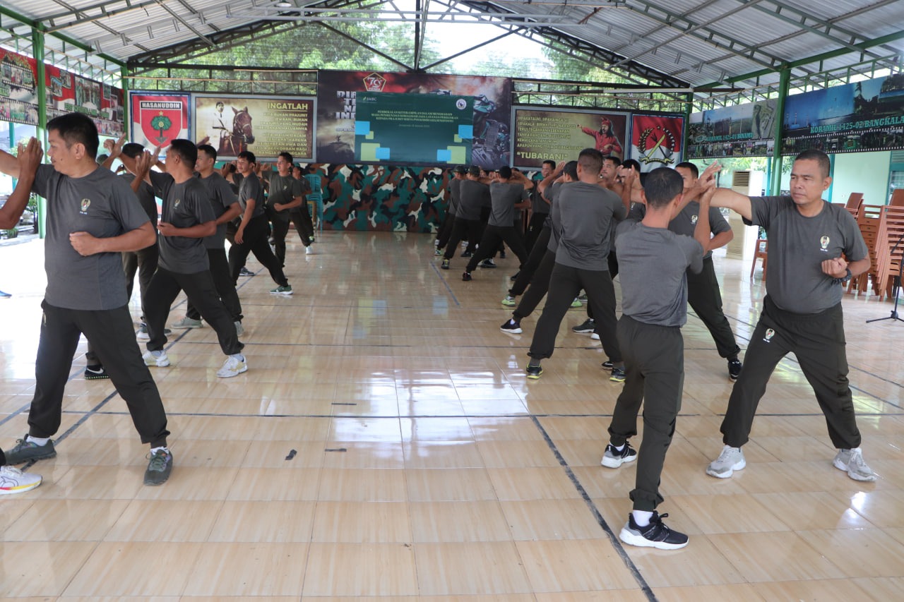 Latihan ini diawali dengan apel pagi yang dipimpin oleh Perwira Seksi Operasi (Pasi OPS) Lettu Inf Muh. Tola, kemudian dilanjutkan dengan latihan beladiri taktis yang dipandu oleh Bati OPS Serma Asri