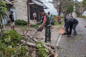 “Sebagai Babinsa, kami bersinergi dengan warga bergotong royong lakukan evakuasi dengan memotong batang pohon yang melintang di badan jalan dan membersihkan ranting-ranting pohon, sehingga arus lalulintas dapat kembali normal,” terangnya.