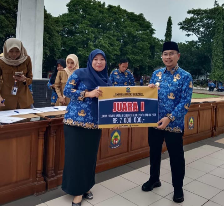 Penyerahan hadiah lomba Inovasi tersebut diserahkan langsung oleh PJ Bupati Jeneponto Reza Faisal Saleh kepada Direktur RSUD Lanto Dg Pasewang dr. ST Pasriyani, setelah usai Upacara Hari Kesadaran Nasional, di Halaman Kantor Bupati Jeneponto, Senin, 17, Februari 2025.