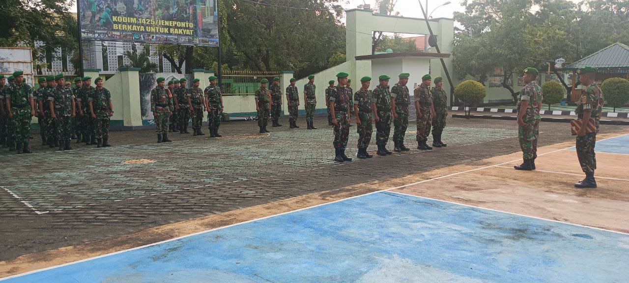 JENEPONTO,Aliemedia.co.od – Moment Pasca Hari Raya Idul Fitri 1446 H, Personel jajaran Kodim 1425 Jeneponto melaksanakan apel pagi yang dipimpin langsung oleh Perwira Seksi Operasi (Pasi Ops) Kodim 1425 Lettu Inf Muhammad Tola, dan dihadiri oleh Perwira staf dan Danramil jajaran, bintara, tamtama dan PNS Kodim 1425 Jeneponto.