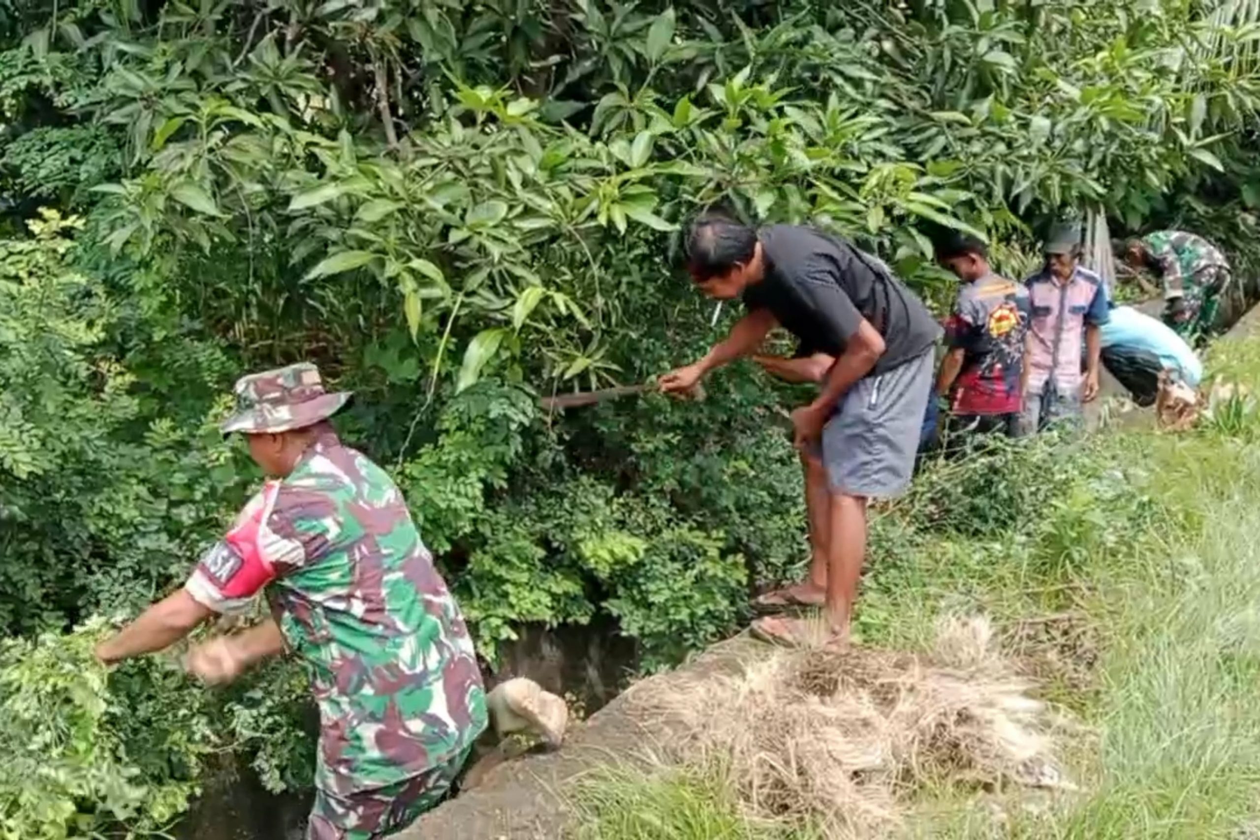 Dengan penuh semangat, Babinsa tak ragu ikut masuk ke dalam saluran untuk membersihkan saluran air aga dapat mengalir dengan lancar.