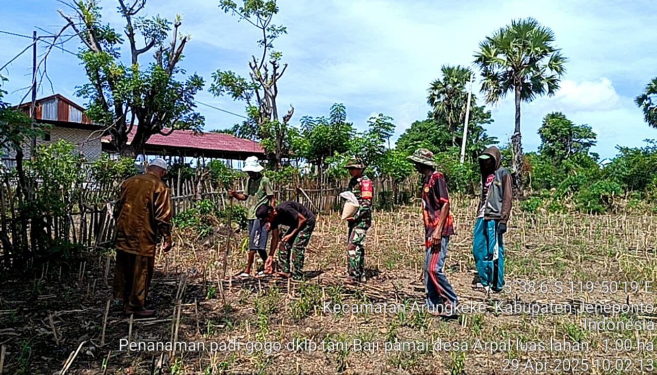 Aliefmedia.co.id, JENEPONTO – Babinsa Koramil 05/Batang Kodim 1425/Jeneponto, Serda Amiruddin, bersama PPL dan Petani melaksanakan kegiatan penanaman padi gogo dilahan milik Bapak Abdul Azis warga Dusun Arungkeke Desa Arungkeke Pallantikang Kecamatan Arungkeke Kabupaten Jeneponto, Selasa, 29/04/2025.