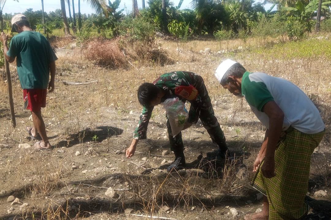 Sertu Alimuddin bersama petani setempat terlihat antusias dalam kegiatan penanaman benih padi Gogo. Mereka bekerja sama untuk menyiapkan lahan dan menanam benih dengan teknik yang benar agar mendapatkan hasil yang optimal.