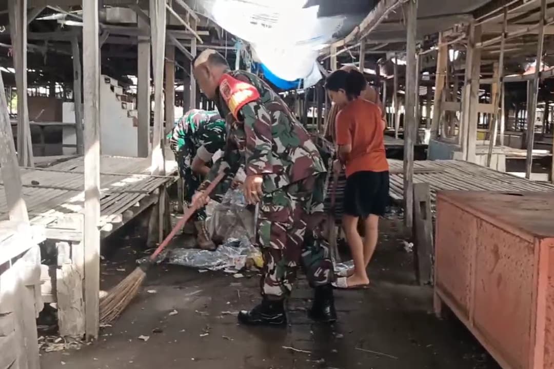Sertu Abdul Rasyid mengatakan, Pagi ini kembali kita gelar kegiatan gotong royong pembersihan di area pasar tradisional dengan mengajak ibu-ibu rumah tangga dan warga setempat.