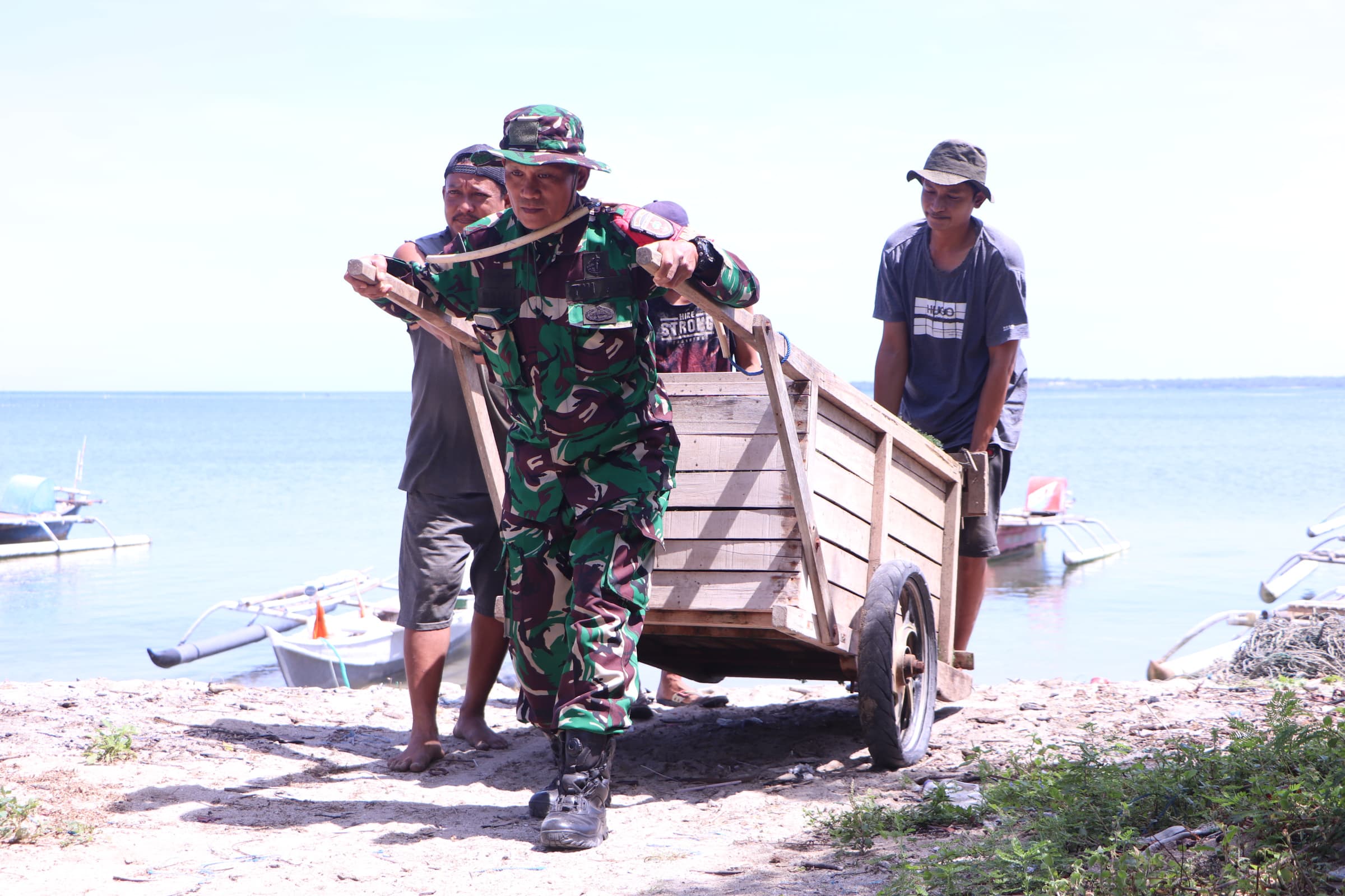 Tanpa pikir panjang, dengan penuh semangat dan kepeduliannya Serda Ramli turun tangan membantu warganya menarik gerobak hingga membersihkan rumput laut. Jum’at, 16/05/2025.