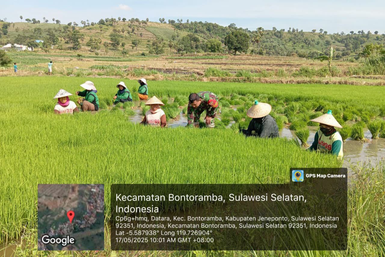 Sertu Suhafid dalam pendampingannya, membantu mencabut bibit padi siap tanam di lahan seluas 1 Hektar, bertempat di Dusun Tamasongo Desa Datara Kecamatan Bontoramba Kabupaten Jeneponto. Sabtu, 17/05/2025.