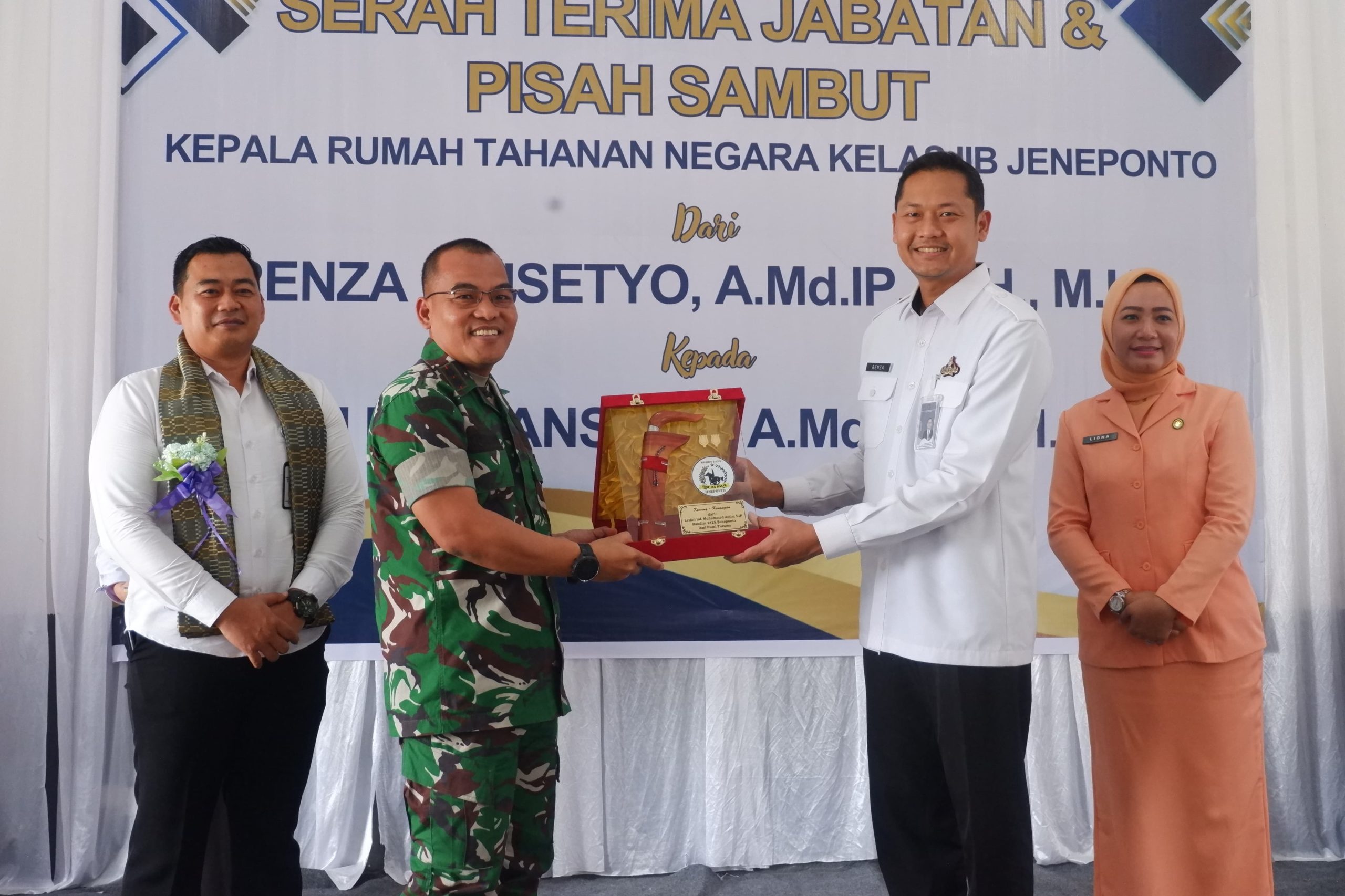 Dalam kesempatan itu, Dandim Jeneponto Letkol Inf Muhammad Amin, berikan Cendera mata kepada pejabat lama Rutan kelas II Jeneponto, Renza Maisetyo.
