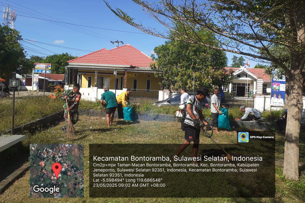 Aliefmedia.co.id, JENEPONTO – Babinsa Koramil 03/Tamalatea Kodim 1425/Jeneponto, Sertu Lukman bersama aparat pemerintah Kelurahan Bontoramba melaksanakan kerja bakti pembersihan Taman, Macan Bontoramba, Kelurahan Bontoramba Kabupaten Jeneponto. Jum’at, 23/05/2025.