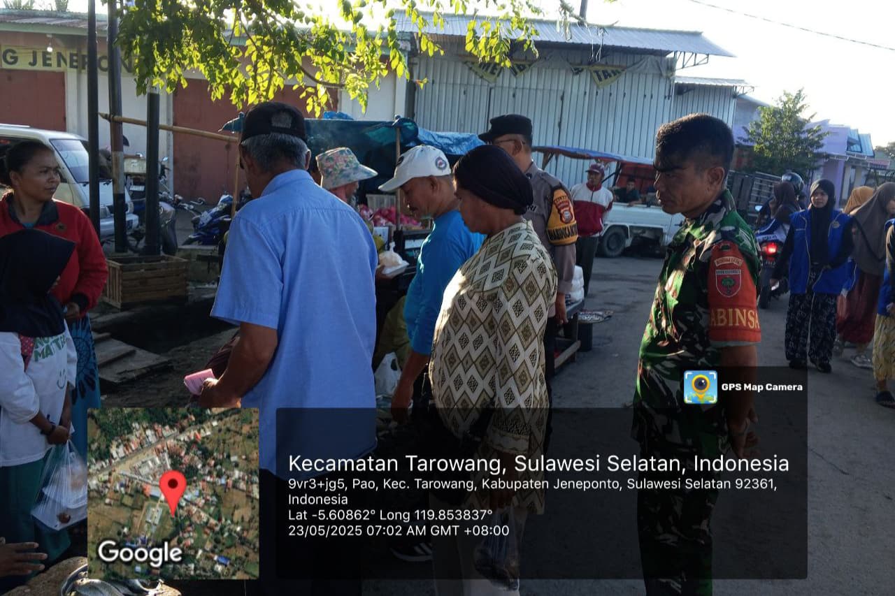 Aliefmedia.ci.id, JENEPONTO – Babinsa Koramil 05/Batang Kodim 1425/Jeneponto, Serda Sudarman, kolaborasi dengan aparat pemerintah Desa dan Bhabinkamtibmas, gelar kegiatan pemantauan wilayah dalam rangka penertiban pedagang yang berjualan di luar area Pasar.