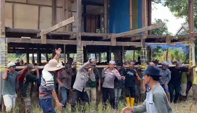 Dikatakan, Polisi ikut membantu mengangkat dan memindahkan rumah panggung yang terbuat dari kayu dengan bergotong royong bersama warga.