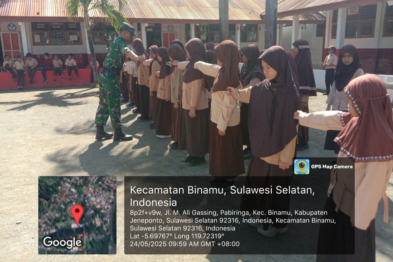Aliefmedia.co.id,JENEPONTO – Dalam upaya menanamkan nilai kedisiplinan dan semangat kebangsaan sejak dini, Babinsa Koramil 01/Bangkala Kodim 1425/Jeneponto, Sertu Abdullah, melaksanakan pelatihan Peraturan Baris-Berbaris (PBB) kepada Siswa-siswi UPT SD Negeri 16 Binamu, Kelurahan Pabiringa, Kecamatan Binamu, Kabupaten Jeneponto. Sabtu, 24/05/2025.