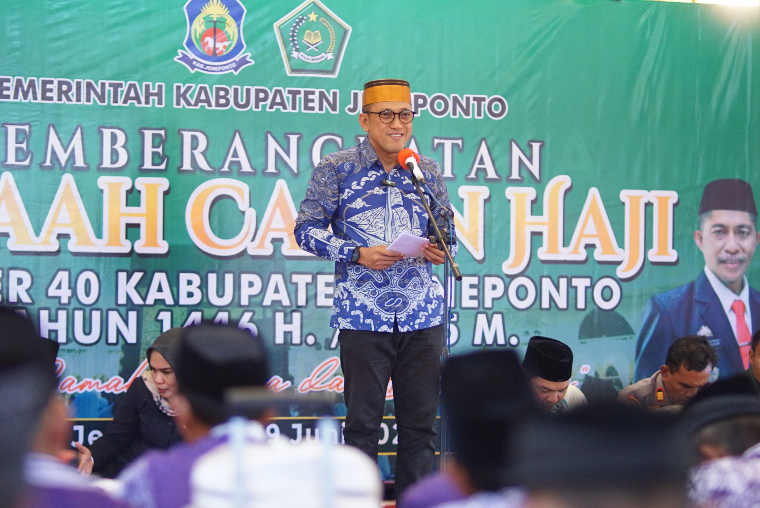 Bupati Jeneponto Paris Yasir dalam sambutannya menyampaikan rasa syukur atas keberangkatan para calon haji yang telah menunggu bertahun-tahun untuk dapat menunaikan rukun Islam kelima.