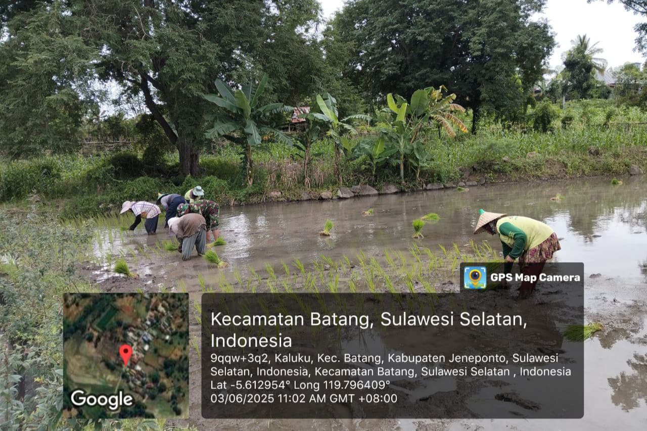 Dengan semangat tanpa pamrih, Babinsa Serka Nasir terjun langsung ke sawah membantu petani di wilayah binaanya, Desa Kaluku Kecamatan Batang, Kabupaten Jeneponto. Selasa, 3/06/2025. dalam kegiatan tanam padi musim tanam ke dua tahun ini.