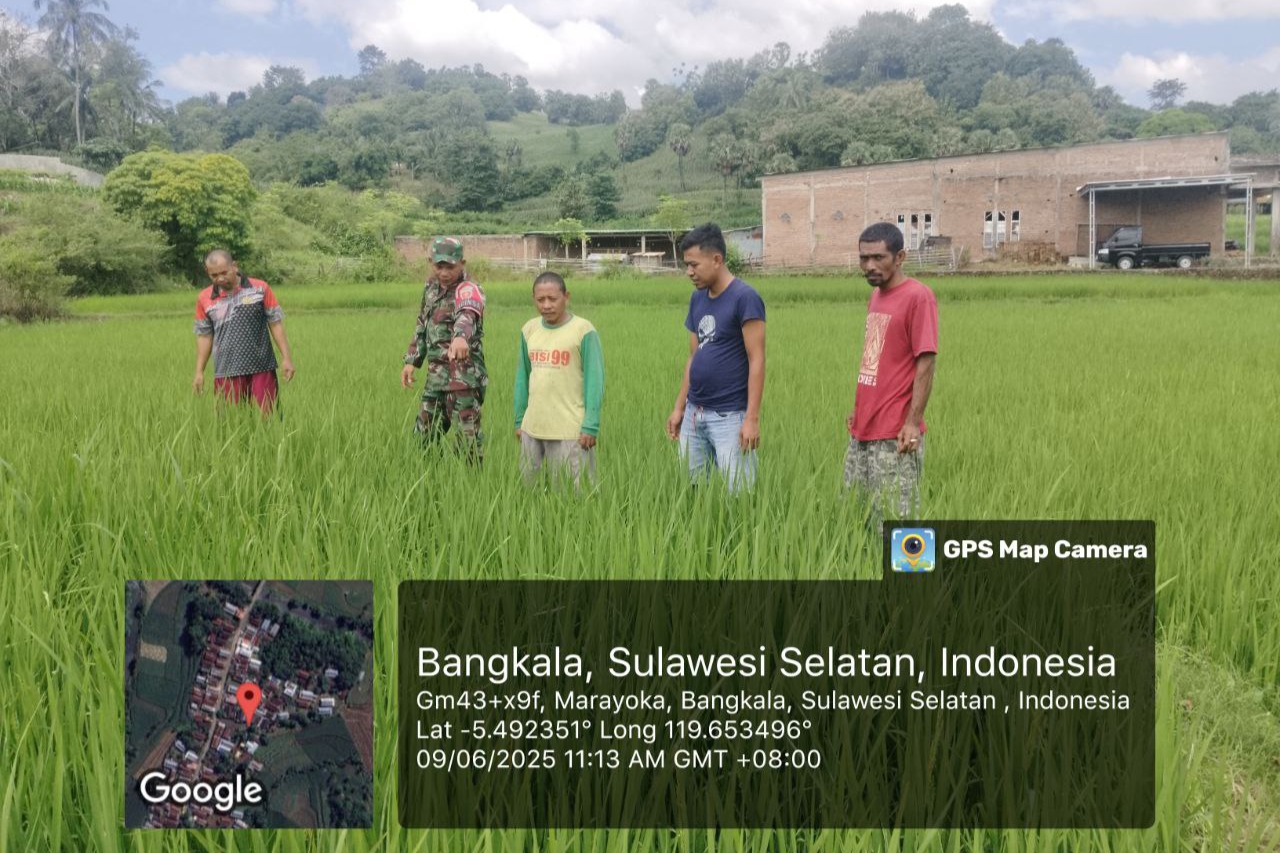 Dalam kegiatan pendampingan ini, Serka Dahlan tidak hanya berdiri di pinggir sawah. Ia turun langsung ke tengah hamparan padi, berdialog hangat dengan petani, memeriksa daun-daun hijau yang mulai menguning, dan memberikan semangat kepada para petani agar tetap optimis menghadapi tantangan musim tanam.