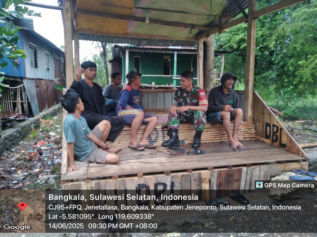 Jeneponto, Aliefmedia.co.id – Dalam suasana penuh keakraban, Babinsa Koramil 02/Bangkala Kodim 1425/Jeneponto, Sertu Erwin, melaksanakan komunikasi sosial (Komsos) bersama sejumlah pemuda di Desa Jenetallasa, Kecamatan Bangkala. Sabtu, 14 Juni 2025.