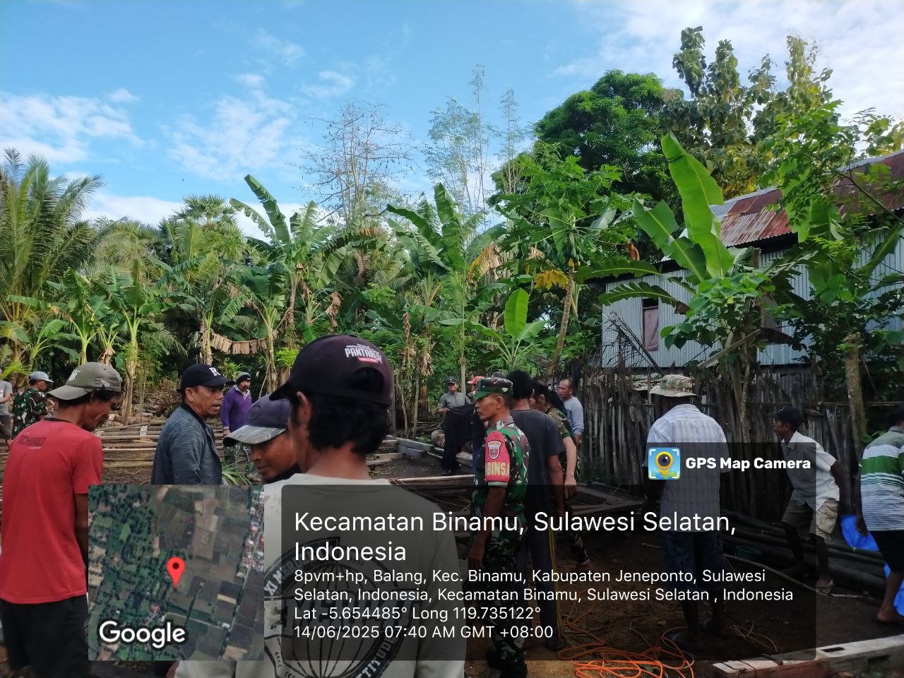 Babinsa Koramil 01/Binamu Kodim 1425/Jeneponto, Serka Haruna, turut ambil bagian dalam proses pembangunan rumah warga dengan penuh semangat bersama masyarakat sekitar. Sabtu, 14 Juni 2025.