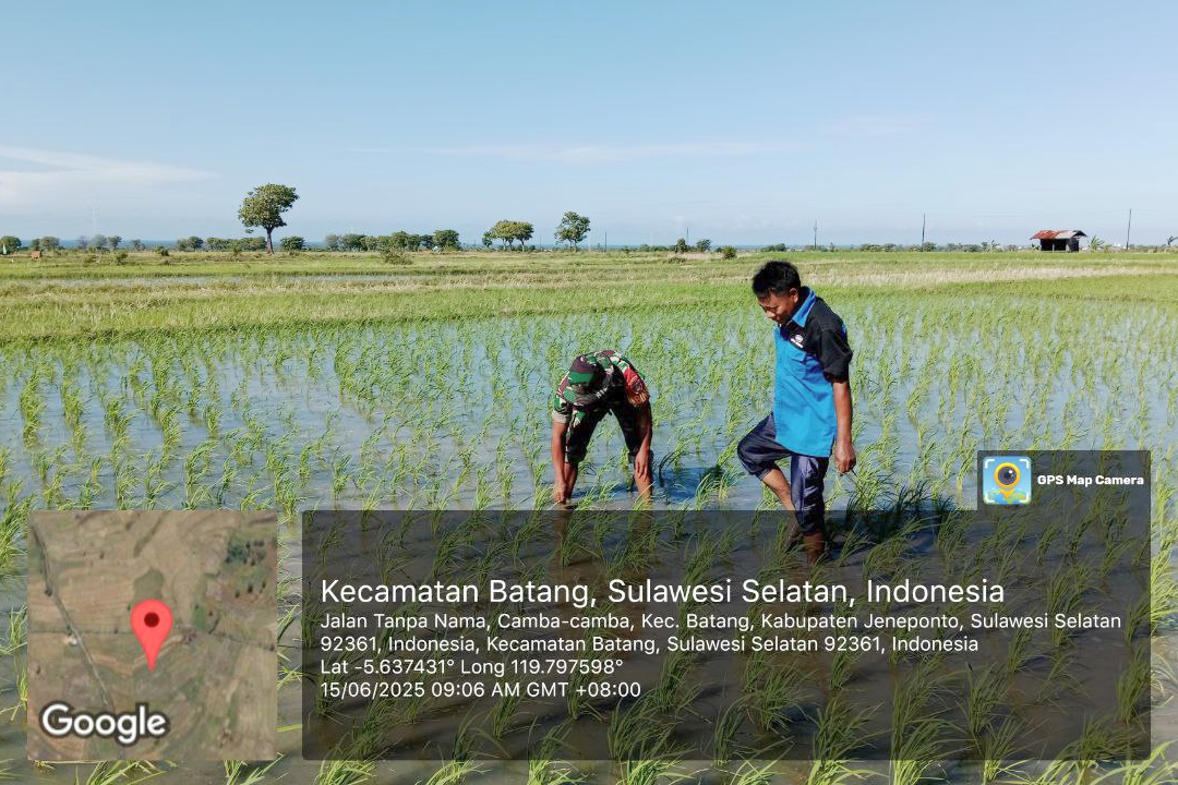 Jeneponto, Aliefmedia.co.id – TNI kembali menunjukkan komitmennya dalam mendampingi rakyat. Kali ini, Babinsa Koramil 05/Batang Kodim 1425/Jeneponto, Serda Jufri, turun langsung ke sawah membantu petani membersihkan gulma di lahan seluas 1,5 hektar milik Daeng Roa, anggota Kelompok Tani Ali Syam. Minggu, 15/6/2025.