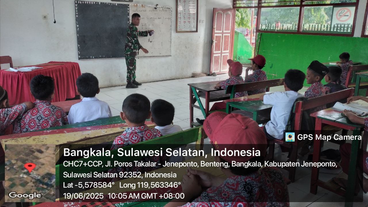 Jeneponto, Aliefmedia.co.id – Dalam rangka mendukung peningkatan kualitas pendidikan di wilayah binaan, Babinsa Koramil 02/Bangkala Kodim 1425/Jeneponto, Serda Herman, turun langsung ke sekolah dan memberikan materi pelajaran Matematika dengan metode GASING (Gampang, Asyik, dan Menyenangkan) kepada para siswa UPT SDN 1 Bangkala, Lingkungan Alluka, Kelurahan Benteng, Kecamatan Bangkala, Kabupaten Jeneponto, Kamis, 19/6/2025.