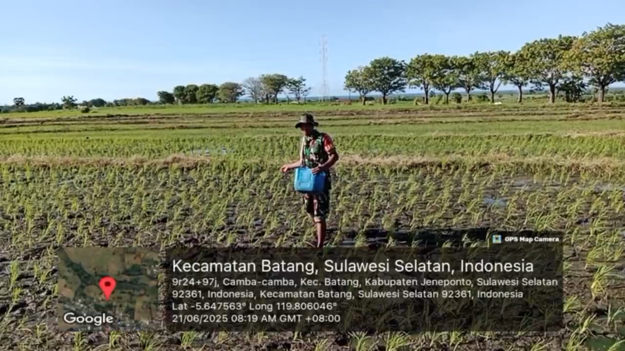 Jeneponto, Aliefmedia.co.id – Di tengah terik mentari pagi, semangat tak pernah surut ditunjukkan oleh Babinsa Koramil 05/Batang Kodim 1425/Jeneponto, Serda Jufri. Ia terlihat sigap dan penuh antusias mendampingi pemupukan pertama tanaman padi milik Bapak Ahmad, seorang petani ulet di Dusun Bungung Lantang, Desa Camba-camba, Kecamatan Batang, Kabupaten Jeneponto. Sabtu, 21/6/2025.