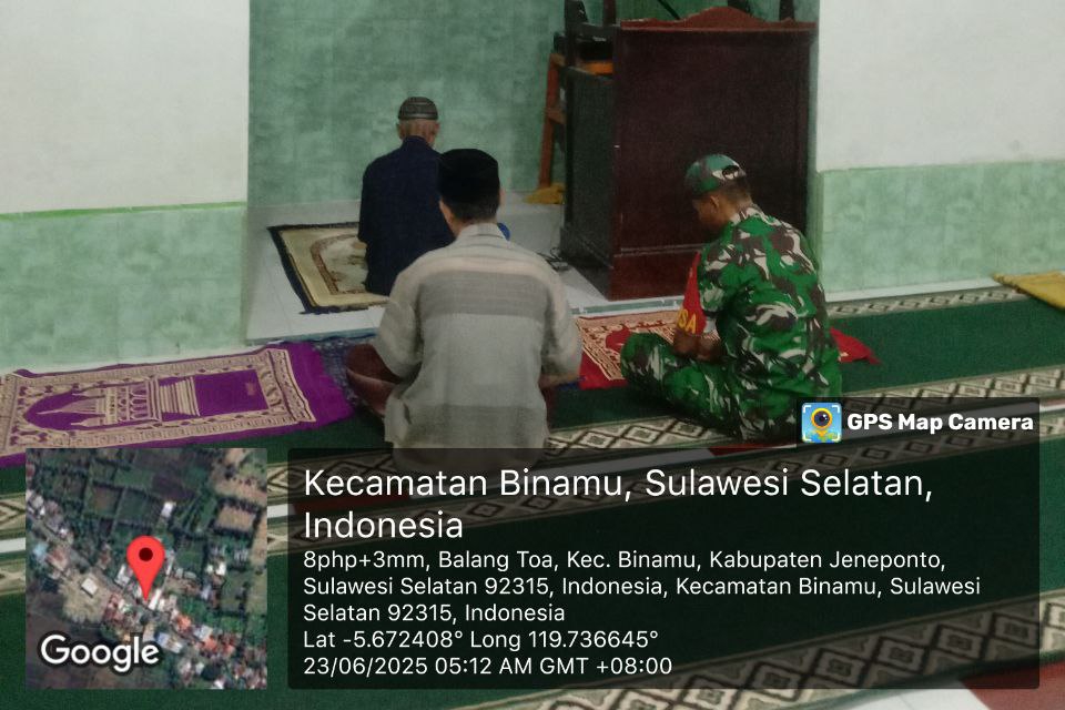 Dimana para Babinsa jajaran Kodim 1425/Jeneponto, menyapa masyarakat lewat ibadah Sholat Subuh berjamaah, yang kemudian dilanjutkan dengan Komunikasi Sosial (Komsos) bersama tokoh agama dan warga, Senin, 23/6/2025.