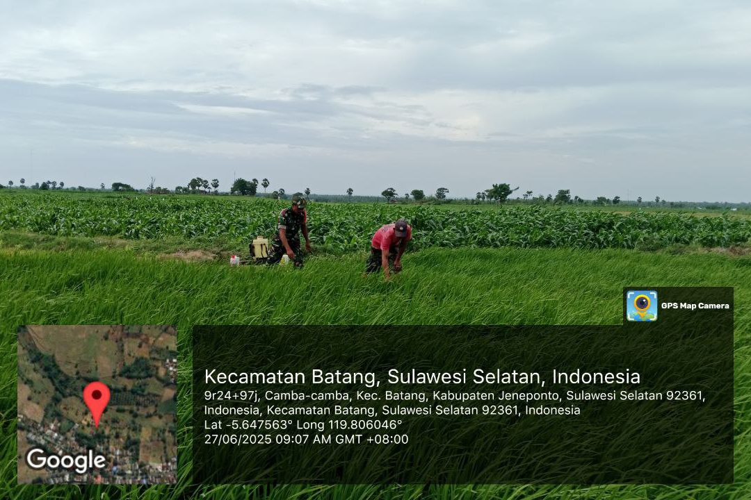 Jeneponto, Aliefmedia.co.id – Di tengah hamparan hijau yang menyejukkan mata, Babinsa Koramil 05/Batang Kodim 1425/Jeneponto, Serda Jufri, tampak akrab bersama petani memantau pertumbuhan tanaman padi di Dusun Bungung Lantang, Desa Camba-camba, Kecamatan Batang, Kabupaten Jeneponto. Jum’at, 27/06/2025.