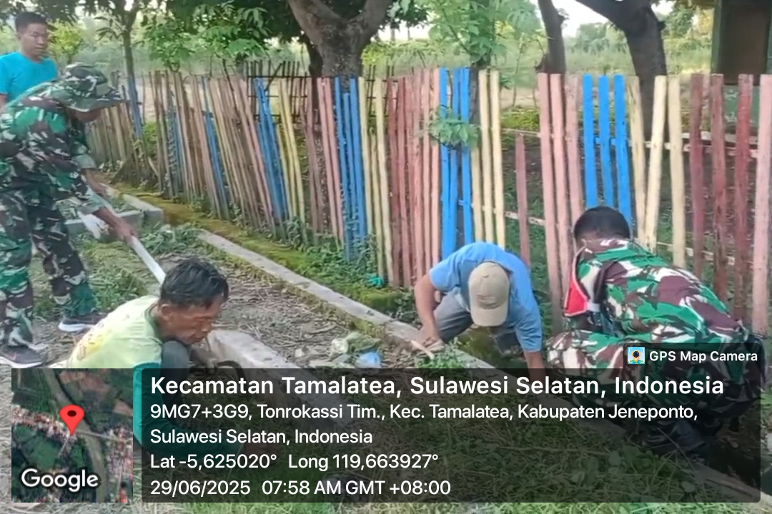 Jeneponto, Aliefmedia.co.id – Semangat kebersamaan kembali ditunjukkan oleh Babinsa Koramil 03/Tamalatea Kodim 1425/Jeneponto, Serka H. Hamsir, bersama warga masyarakat di wilayah Lingkungan Bangka-bangkala, Kelurahan Tonrokassi Timur, Kecamatan Tamalatea, Kabupaten Jeneponto, dengan melaksanakan kerja bakti pembersihan saluran air, Minggu, 28/06/2025.