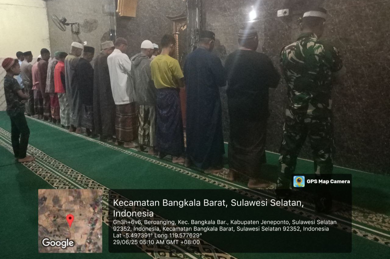 Jeneponto, Aliefmedia.co.id – Kebersamaan dan kedekatan Babinsa jajaran Kodim 1425/Jeneponto dengan masyarakat terus terjaga, salah satunya lewat kegiatan Sholat Subuh berjamaah yang rutin dilaksanakan di wilayah binaan masing-masing. Minggu, 29/6/2025.
