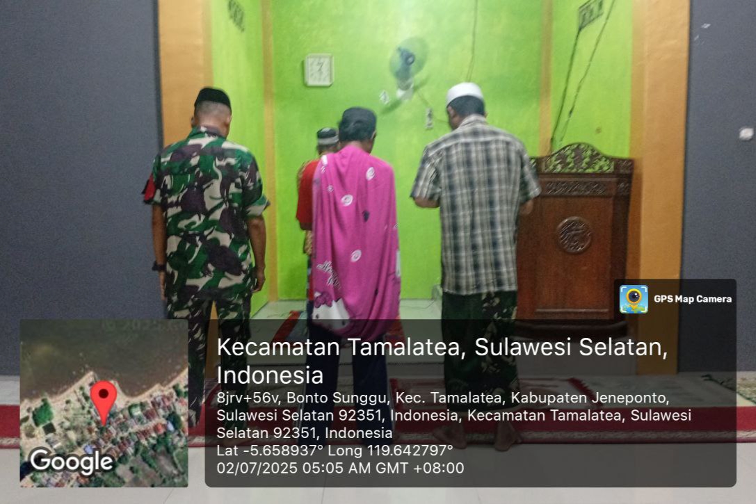Jeneponto, Aliefmedia.co.id – Di tengah suasana hening dan penuh kekhusyukan, Babinsa Koramil 03/Tamalatea Kodim 1425/Jeneponto, Serda Ramli, terlihat khusyuk menunaikan ibadah sholat Subuh berjamaah bersama warga dan tokoh agama di Masjid Nur Rahmat, Desa Bontosunggu, Kecamatan Tamalatea, Rabu, dini hari 02/07/2025.