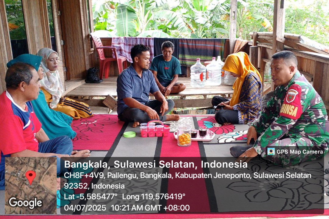 Jeneponto, Aliefmedia.co.id – Babinsa Koramil 02/Bangkala Kodim 1425/Jeneponto, Serka Misbahuddin, melaksanakan kegiatan Komunikasi Sosial (Komsos) bersama warga binaannya di Lingkungan Sodoa, Kelurahan Pallengu, Kecamatan Bangkala, Kabupaten Jeneponto, Jumat, 4/7/2025.