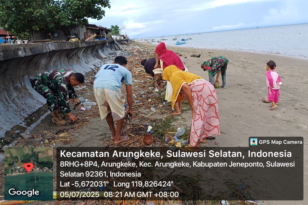 Dengan semangat gotong royong yang tinggi, Babinsa dan warga bahu-membahu membersihkan tumpukan sampah plastik dan dedaunan kering yang berserakan akibat ombak dan angin laut.