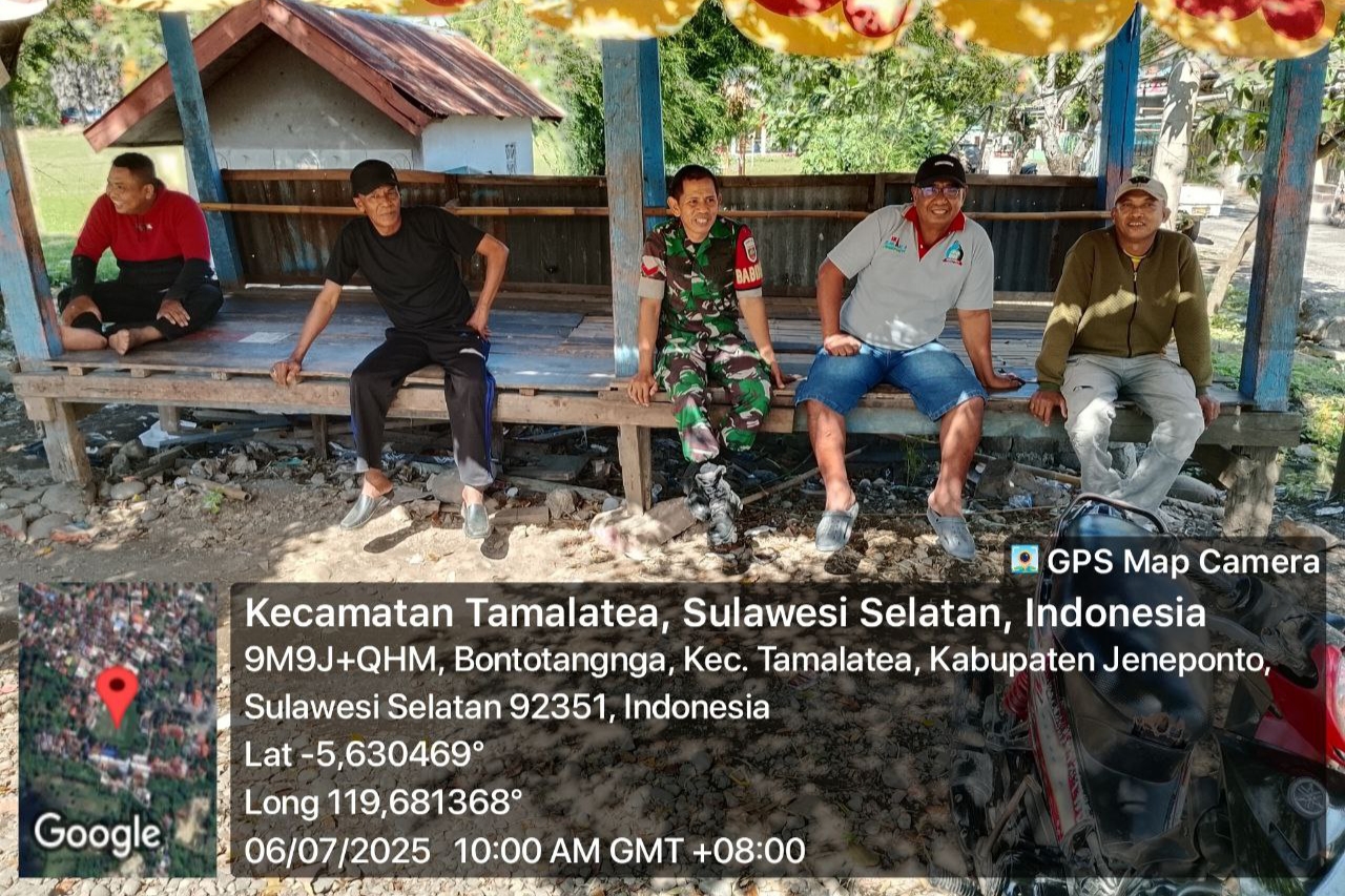 Jeneponto, Aliefmedia.co.id – Babinsa Koramil 103/Tamalatea Kodim 1425/Jeneponto, Koptu Abdul Haris, secara rutin melaksanakan komunikasi sosial (Komsos) dengan elemen masyarakat di wilayah binaanya, tepatnya di Lingkungan Sarroanging, Kelurahan Bontotangnga, Kecamatan Tamalatea, Kabupaten Jeneponto. Minggu, 6/7/2025.