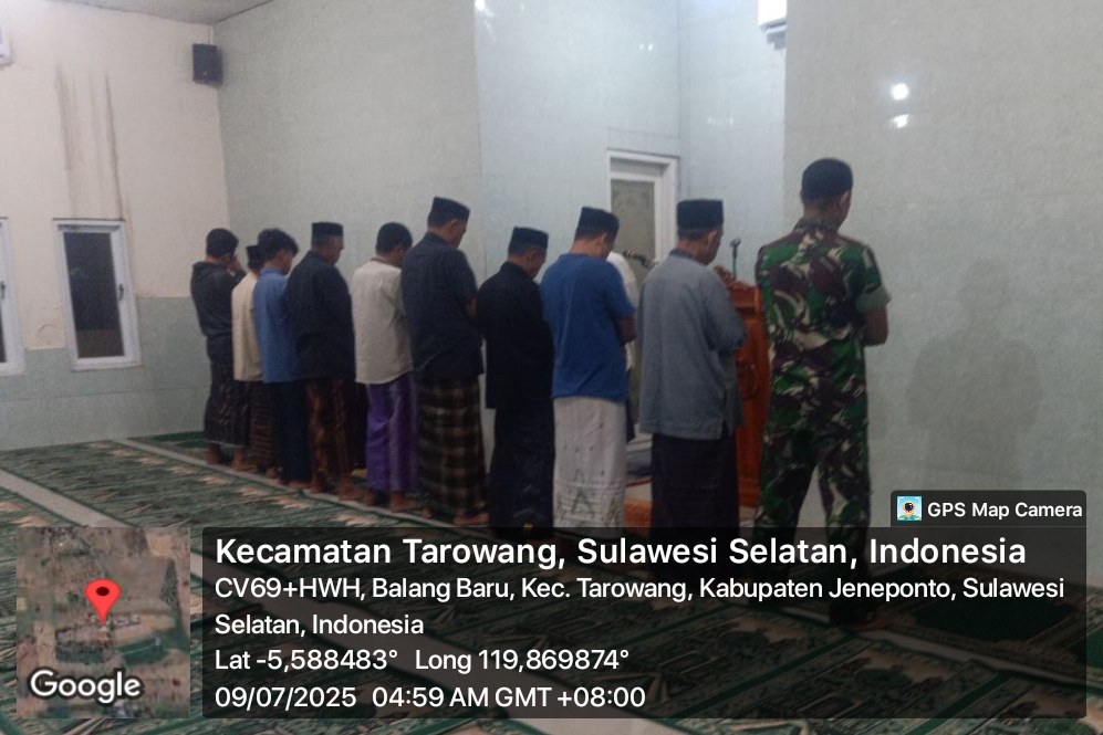Jeneponto, Aliefmedia.co.id – Sebagai wujud kedekatan dan pembinaan teritorial, Babinsa Koramil 05/Batang Kodim 1425/Jeneponto, Sertu Abdul Rahim, melaksanakan Sholat Subuh berjamaah bersama warga di Masjid Nurul Iman, Desa Balang Baru, Kecamatan Tarowang, Kabupaten Jeneponto, Rabu, 9/7/2025.