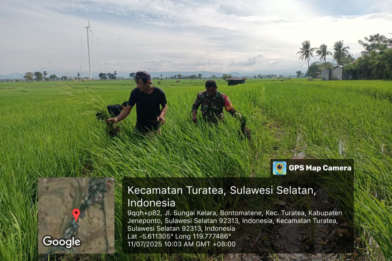 Dengan semangat kebersamaan, Sertu Abdul Rasyid ikut mencabut gulma di sela-sela tanaman padi. Kegiatan ini bukan sekadar kerja fisik, melainkan wujud nyata kedekatan dan kepedulian TNI terhadap kesejahteraan masyarakat, khususnya para petani yang menjadi ujung tombak ketahanan pangan di daerah.