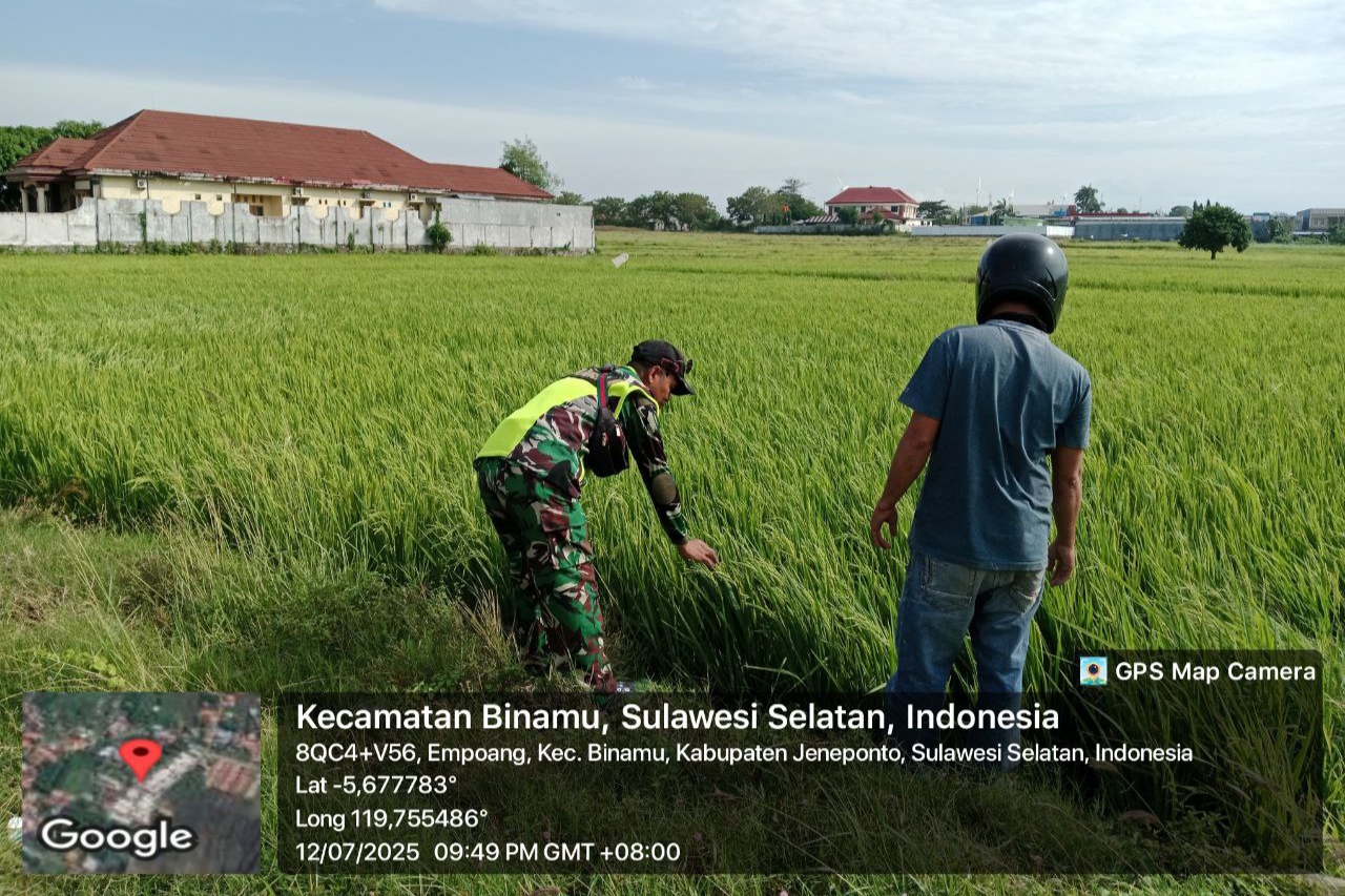 Jeneponto, Aliefmedia.co.id – Babinsa Koramil 01/Binamu Kodim 1425/Jeneponto, Serda Agus Salim, turun langsung ke sawah bersama petani untuk meninjau perkembangan tanaman padi di Kelurahan Empoang, Kecamatan Binamu, Kabupaten Jeneponto, Sabtu, 12/7/2025.