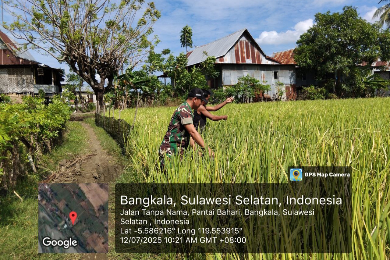 Seperti yang dilakukan, Kopka Amiruddin, anggota Koramil 02/Bangkala Kodim 1425/Jeneponto, Babinsa Kelurahan Pantai Bahari, Kecamatan Bangkala, Kabupaten Jeneponto, melakukan pemantauan perkembangan tanaman padi siap panen. Sabtu, 12/07/2025.