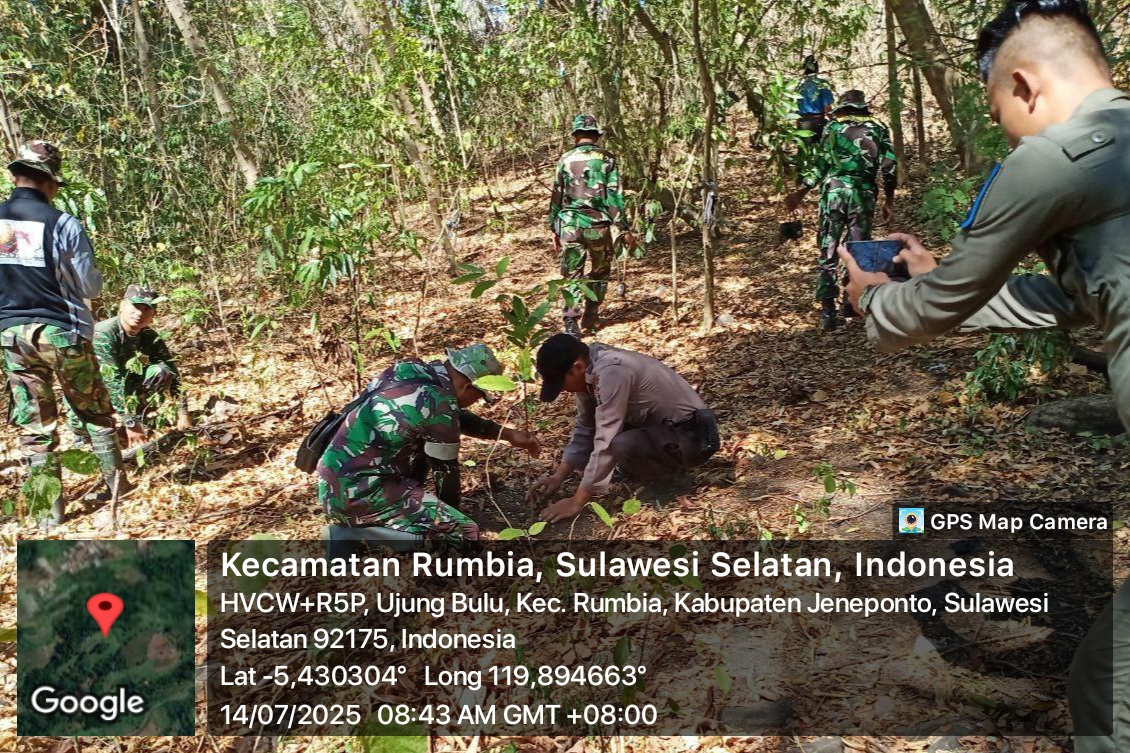 Jeneponto, Aliefmedia.co.id – Dalam semangat menjaga alam untuk generasi mendatang, Babinsa Koramil 04/Kelara Kodim 1425/Jeneponto bersama perangkat desa dan instansi terkait menggelar kerja bakti penanaman 200 pohon Jati Putih, di Dusun Biringbulu, Desa Ujung Bulu, Kecamatan Rumbia, Kabupaten Jeneponto. Senin, 14/07/2025.