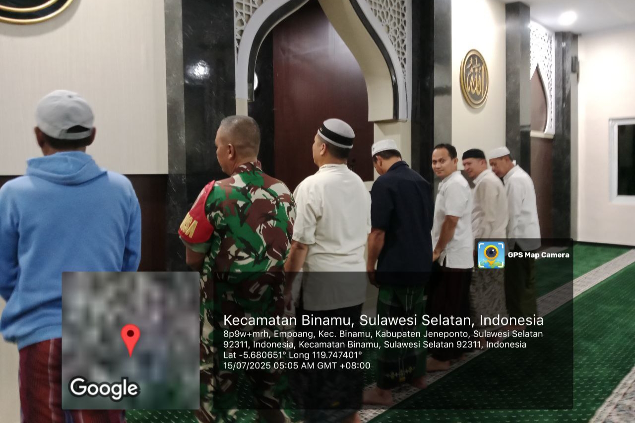 Jeneponto, Aliefmedia.co.id – Dalam rangka mempererat silaturahmi dan meningkatkan komunikasi dengan warga, Babinsa Koramil 01/Binamu Kodim 1425/Jeneponto, Serda Agus Salim, melaksanakan sholat Subuh berjamaah bersama masyarakat di Masjid Nurul Iman, Kelurahan Empoang, Kecamatan Binamu, Kabupaten Jeneponto, Selasa, 14/7/2025.