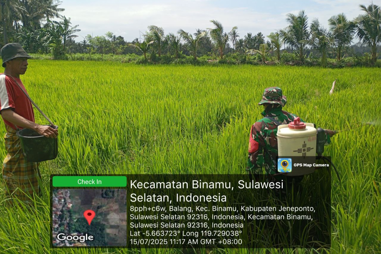 Jeneponto, Aliefmedia.co.id – Di tengah upaya menjaga ketahanan pangan, Babinsa Koramil 01/Binamu Kodim 1425/Jeneponto, Koptu Abidin, menunjukkan aksi nyata dengan mendampingi dan membantu petani melakukan penyemprotan hama tanaman padi di Lingkungan Pacceko, Kelurahan Balang, Kecamatan Binamu, Kabupaten Jeneponto, Selasa, 15/7/2025.