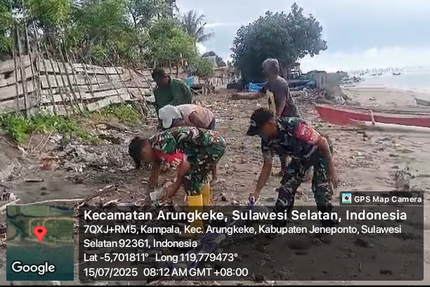 Jeneponto, Aliefmedia.co.id – Babinsa Koramil 05/Batang Kodim 1425/Jeneponto bersama warga Dusun Monro Loe, Desa Kampala, Kecamatan Arungkeke, kompak menggelar kerja bakti pembersihan pantai, Selasa, 14/7/2025.
