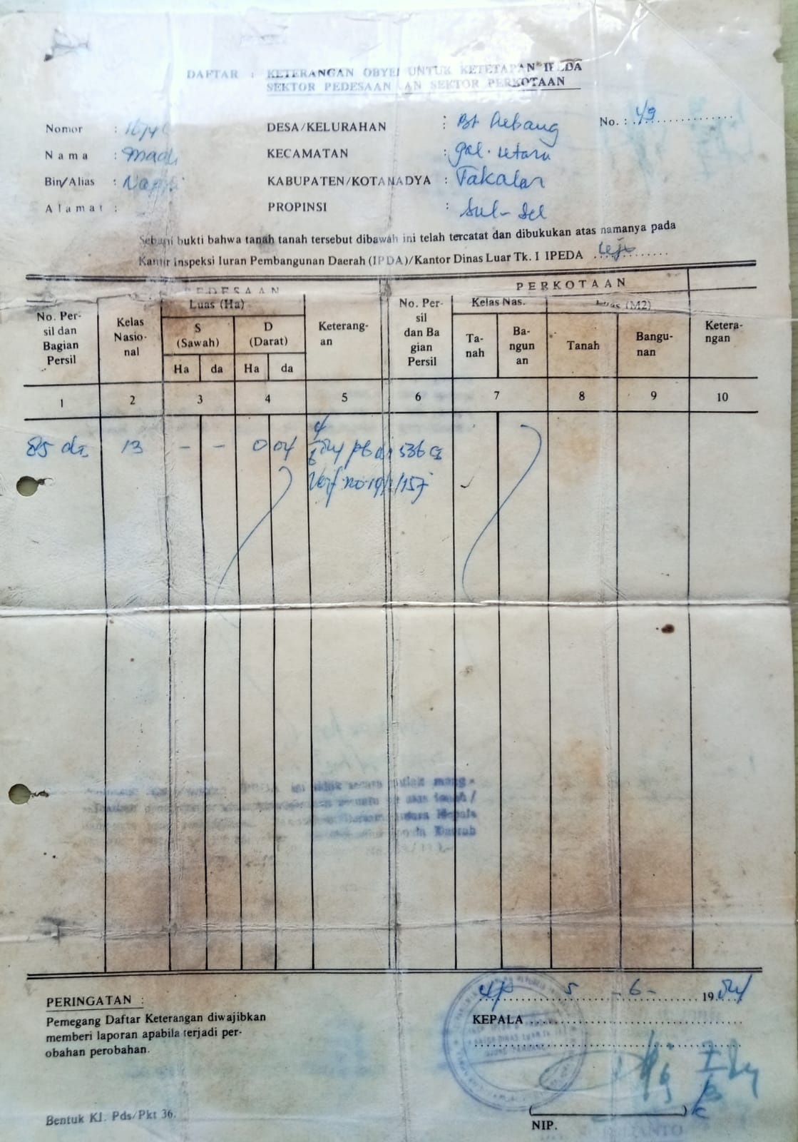 Adapun bukti pendukung yang dimiliki Jupri Dg Limpo pemberian Almarhum orang tuanya ( Maddi Dg Bonto Bin Nappu) yakni berupa surat Daftar keterangan Objek Pajak untuk ketetapan “IPEDA” Sektor Pedesaan dan Sektor Perkotaan dengan nomor 1674 C atas nama Maddi Bin Nappu alamat Desa/Kelurahan Bontolebang Nomor 49 kecamatan Galesong Utara Sebagai Bukti tanah tersebut telah tercatat dan di bukukan atas namanya ( Maddi Bin Nappu ) pada kantor inspeksi iuran pembangunan Daerah ( IPEDA ) Kantor dinas luar Tingkat I IPEDA Ujung pandang dengan nomor Persil 85 DI Luas 400M2 ( 4 Are ) tercatat tanggal 05 bulan Juni tahun 1984
