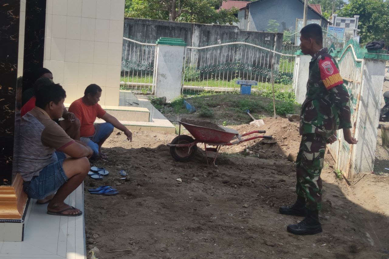 Kegiatan ini dilakukan sebagai bagian dari tugas pembinaan teritorial guna menciptakan situasi aman, nyaman, dan kondusif di lingkungan masyarakat. Serda Iwang tampak berdialog langsung dengan warga yang sedang beraktivitas di sekitar halaman Masjid, sekaligus memantau perkembangan situasi di wilayah tersebut.