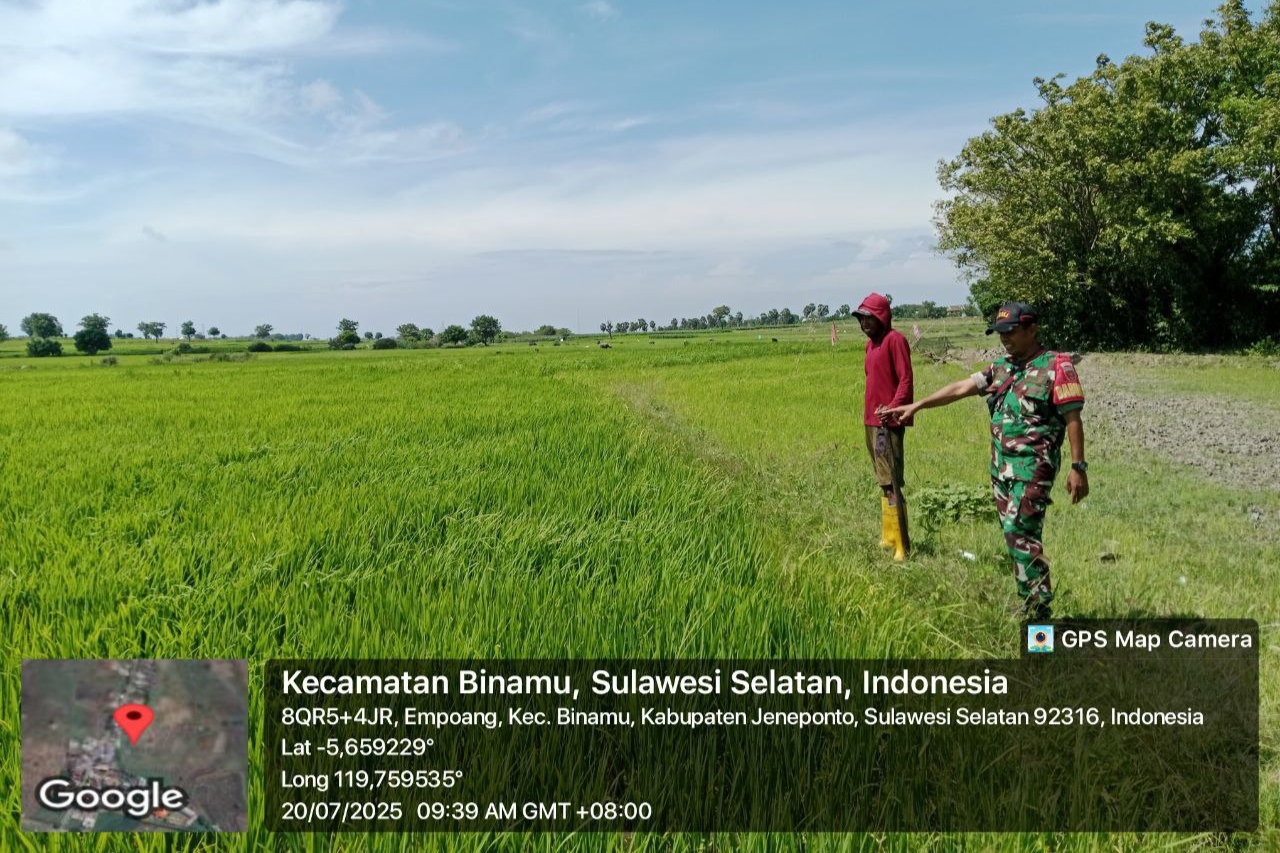 Jeneponto, Aliefmedia.co.id – Pemandangan hijau terhampar luas di Lingkungan Agangjene, Kelurahan Empoang, Kecamatan Binamu, Kabupaten Jeneponto. Itu terlihat saat Babinsa Koramil 01/Binamu Kodim 1425/Jeneponto, Serda Agus Salim, bersama petani setempat tampak bersemangat meninjau tanaman padi yang tengah memasuki masa tumbuh.