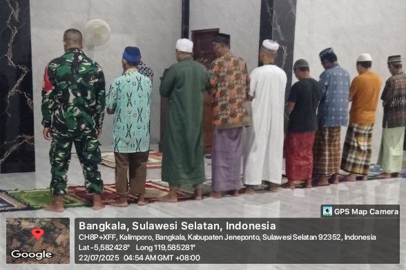 Jeneponto, Aliefmedia.co.id – Babinsa Koramil 02/Bangkala Kodim 1425/Jeneponto, Koptu Jumaris, melaksanakan ibadah Sholat Subuh berjamaah bersama warga di Masjid Masjid Nurul As-suhada Dusun Tanatoa Deda Kalimporo Kecamatan Bangkala Kabupaten Jeneponto. Selasa, 22/07/2025.