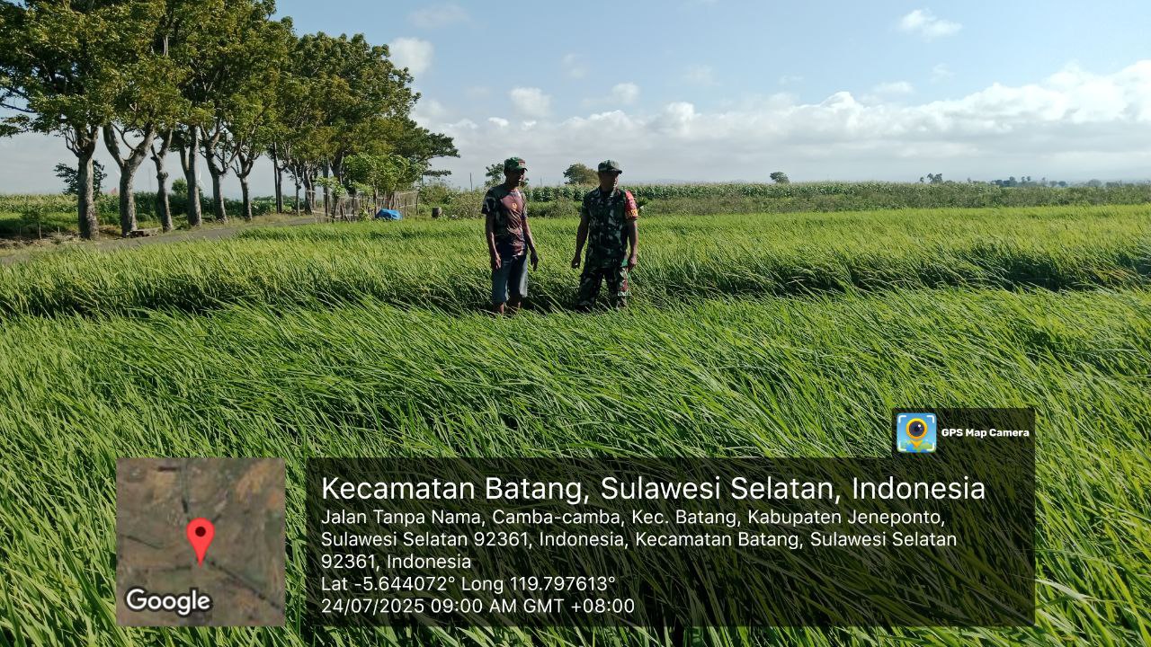 Jeneponto, Aliefmedia.co.id – Babinsa Koramil 05/Batang Kodim 1425/Jeneponto, Serda Jufri melaksanakan pendampingan dan pemantauan terhadap tanaman padi milik petani binaannya di Desa Camba-camba, Kecamatan Batang, Kabupaten Jeneponto, Kamis, 24/07/2025.