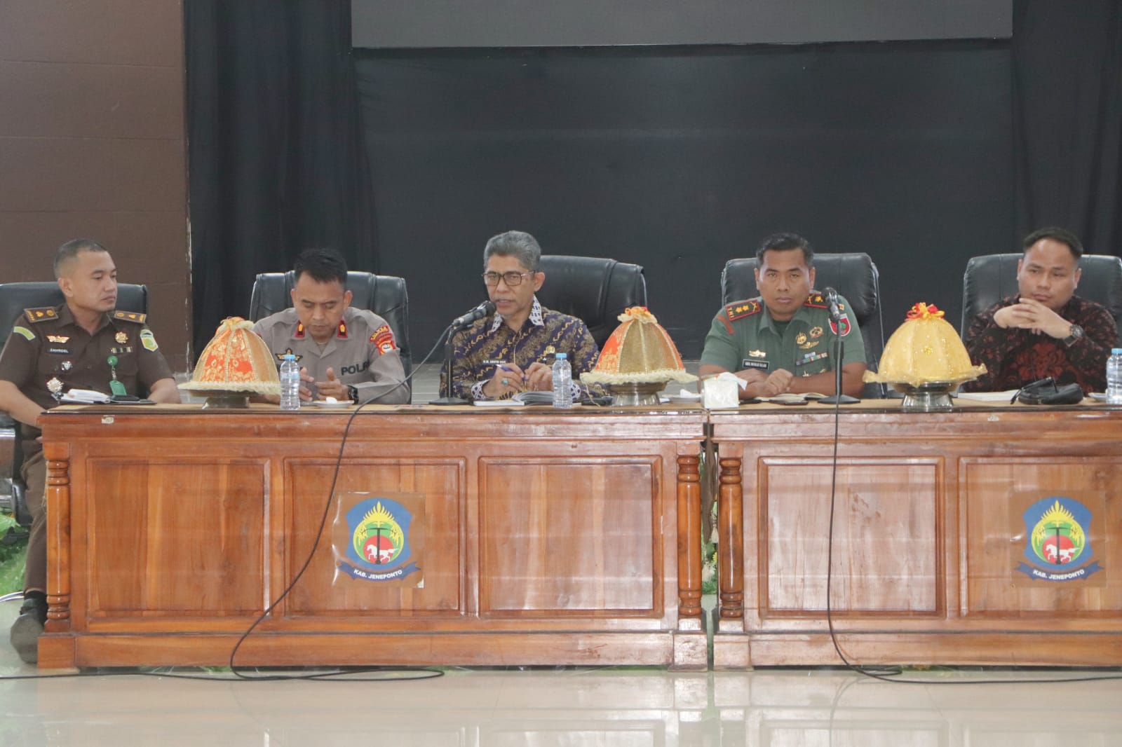 Rapat tersebut dipimpin oleh Sekretaris Daerah Jeneponto H. Muh. Nur Arifin, S.H., M.H. dan dihadiri sejumlah pejabat penting, di antaranya Wakapolres Jeneponto, Kasi Intel Kejari Jeneponto, Panitera Pengadilan Negeri Jeneponto, pimpinan OPD, para camat, serta kepala BUMN se-Kabupaten Jeneponto.