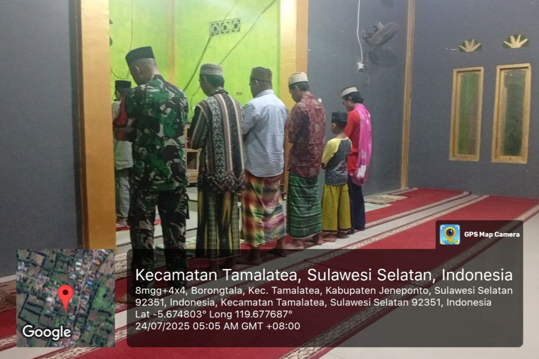 Jeneponto, Aliefmedia.co.id – Dalam upaya mempererat tali silaturahmi dan memperkuat peran pembinaan teritorial, Babinsa Koramil 03/Tamalatea Kodim 1425/Jeneponto, Serda Ramli, melaksanakan ibadah sholat Subuh berjamaah bersama warga di Masjid Nur Rahmat, Desa Bontosunggu, Kecamatan Tamalatea, Kabupaten Jeneponto, Kamis, 24/07/2025.