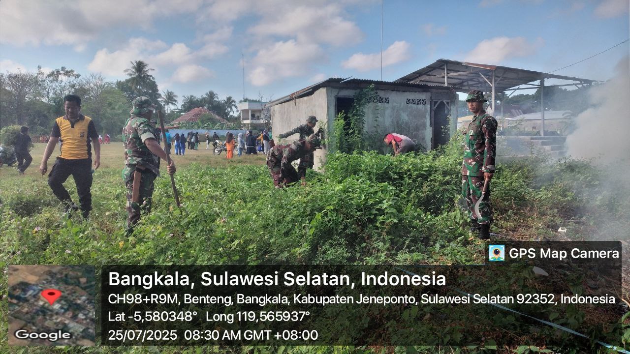 Jeneponto, Aliefmedia.co.id – Babinsa Koramil 02/Bangkala Kodim 1425/Jeneponto bersama anggota Polsek Bangkala dan elemen masyarakat setempat melaksanakan kerja bakti pembersihan Lapangan Bola Allu yang berada di Kelurahan Benteng, Kecamatan Bangkala, Kabupaten Jeneponto. Jumat, 25/07/2025.